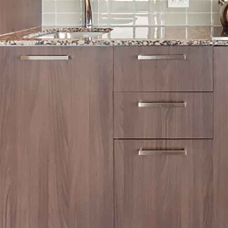 Este material se caracteriza por su excelente calidad, fácil combinación y diseño multiforme, con altísima resistencia a la humedad, al calor y a los golpes, con reducción del peso y por consiguiente más durabilidad de las bisagras, suavidad y falta de ruido al cerrarla. El laminado es uno de los materiales más versátiles y prácticos y se encuentra en numerosos colores, texturas y acabados. Es posible elegirlo en su línea Metallic o Soft. La línea Metallic le agrega al material otra terminación. Gracias a la resistencia y maleabilidad del aluminio, se puede optar por distintos tipos de cantos y tiradores tanto en puertas como cajones. La Soft, le otorga al diseño una estética más minimalista ya que muestra al material en su estado más puro, sin agregados de otros complementos metálicos.